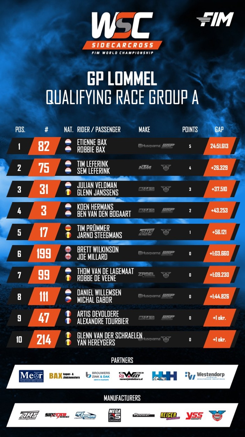 Bax en Keuben winnen kwalificaties WK Zijspancross Lommel by motocrossplanet28 juni 202528 juni 2025 De Nederlandse zijspan combinaties van Bax en Keuben hebben in het diepe zand van Lommel de kwalificatieheats van het WK Zijspancross gewonnen. Bekijk hieronder de volledige uitslagen: Photocredits: WSC
