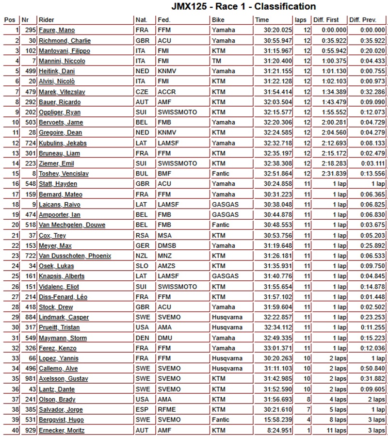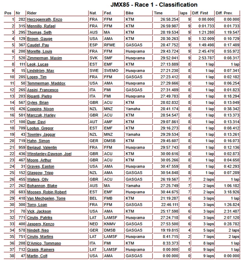 Uitslagen eerste manche WK Jeugd Frankrijk by motocrossplanet6 juli 20256 juli 2025 Kannon Zabojnik (65), Enzo Herzogenrath (85) en Mano Faure (125) hebben de eerste manche van het WK Jeugd in Frankrijk weten te winnen. Bekijk hieronder de volledige uitslagen:
