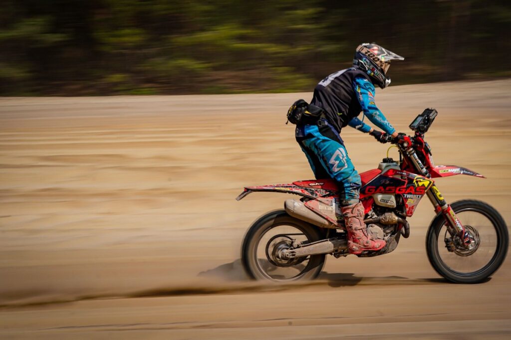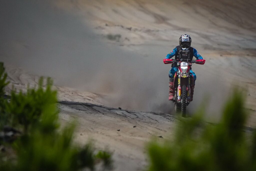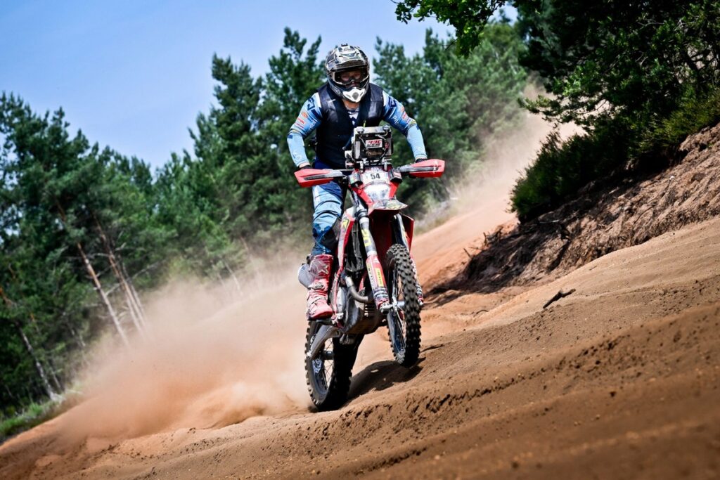 23 juni – Stage 1: “Sand & Forest Challenge” (170 km). Een dynamisch parcours met snelle zandstroken en nauwe bospaden. Jeremy opende de etappe sterk, maar raakte na 44 km samen met een groep rijders de juiste route kwijt. Bij het tankpunt weigerde zijn IRIS-tracker opnieuw op te starten, wat leidde tot kostbare wachttijd. Na herstart volgde een zware crash op een verborgen rots, waarbij de hele navigatietoren kapotging, het stuur krom raakte en Jeremy een flinke smak maakte. Toch bereikte hij de finish – zij het ruim 45 minuten achterstand. De motor werd die avond volledig hersteld.