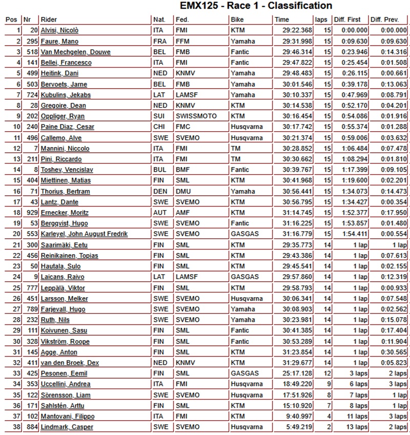 Nicolò Alvisi heeft de eerste manche van de EMX125 klasse in Finland gedomineerd. Alvisi nam gelijk de leiding in handen en sloeg een gat. Mano Faure kwam na een matige start terug naar een tweede plaats en Douwe van Mechgelen finishte op een sterke derde plaats voor zijn teammaat Francesco Bellei en Dani Heitink, die van ver terug naar voren kwam. Jarne Bervoets mengde zich in de strijd om de top vijf en werd zesde voor Jekabs Kubulins en Dean Gregoire, die in de slotfase nog een fout maakte en een positie verloor aan Kubulins.