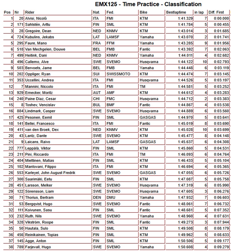 Nicolò Alvisi heeft in de tijdtraining van de EMX125 klasse in Finland de snelste tijd op de klok weten te zetten. Alvisi was bijna een halve seconde sneller dan Arttu Sahlsten en Dean Gregoire trainde als derde. Jekabs Kubulins zette een vierde tijd neer voor Kampioenschapleider Mano Faure.