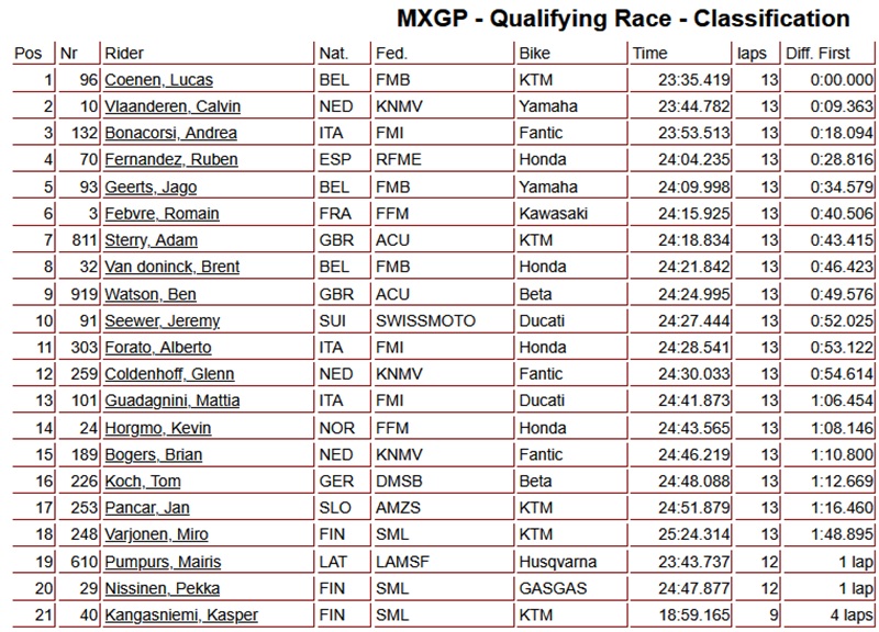 Lucas Coenen heeft de kwalificatie van de MXGP klasse in Finland gedomineerd. Hij won de wedstrijd voor Calvin Vlaanderen en Andrea Bonacorsi. Ruben Fernandez en Jago Geerts kwamen op een vierde en vijfde plaats binnen. Romain Febvre kwam in de eerste ronde in de problemen en moest van ver komen. Hij wist er nog een zesde plaats uit te halen.