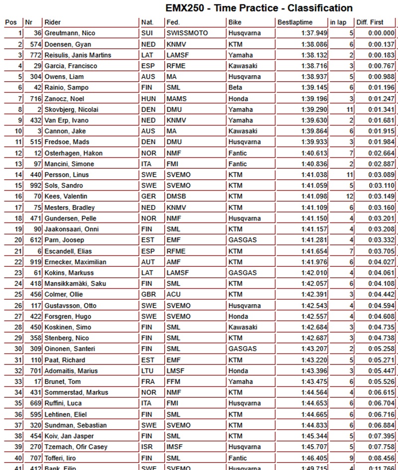 Greutmann snelste in EMX250 Finland voor Doensen by motocrossplanet12 juli 202512 juli 2025 Nico Greutmann heeft in de EMX250 klasse in Finland de pole position gepakt voor Gyan Doensen en Janis Martins Reisulis. Francisco Garcia en Liam Owens maakten de top 5 compleet!