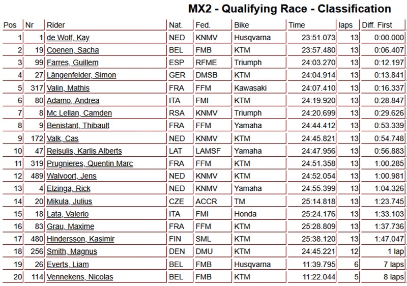 Kay de Wolf heeft de kwalificatieheat van de MX2 klasse in Finland gewonnen. Liam Everts reed in de eerste helft van de wedstrijd aan de leiding maar kwam hard ten val en moest de wedstrijd verlaten. De Wolf nam het commando over en won voor Sacha Coenen en Guillem Farres. WK leider Simon Laengenfelder werd vierde voor Mathis Valin!