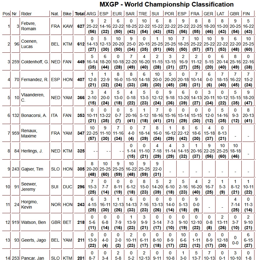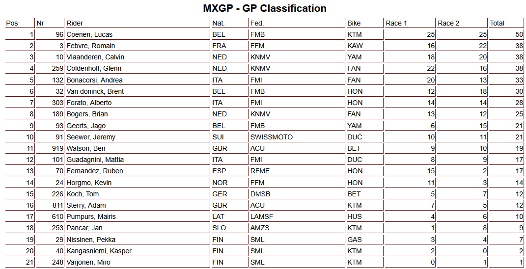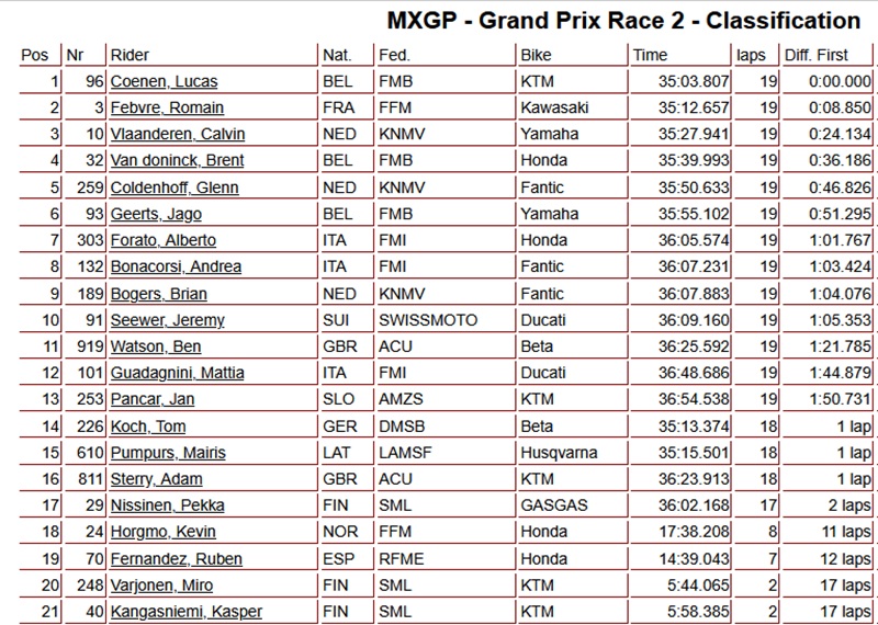 Lucas Coenen heeft beide manches van de Grand Prix van Finland weten te winnen. Hij won de tweede manche voor Romain Febvre en Calvin Vlaanderen. Dit was ook het dag podium vandaag. Brent van Doninck werd knap vierde in de tweede manche en Glenn Coldenhoff kwam na een sterke slotfase als vijfde over de finish!