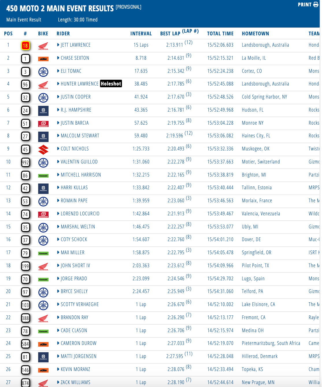De manche werd na een aantal ronden afgevlagd vanwege een ongeval waardoor er een herstart aan te pas moest komen. Jett Lawrence stond na de herstart onder druk van Sexton maar tegen het einde sloeg hij een gat en won de manche!