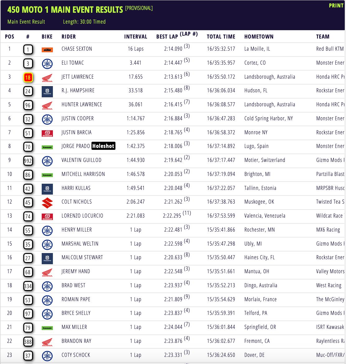 Chase Sexton heeft de eerste manche van de AMA Pro Motocross 450 in Washougal gewonnen. Sexton nam gelijk na de start de leiding en wist de aanvallende Jett Lawrence achter zich te houden. Toen Lawrence ten val kwam, had Sexton een gat en won de manche. Eli Tomac nam door de val van Lawrence de tweede plaats over en wist deze vast te houden tot aan de finish. Lawrence werd derde voor RJ Hampshire en Hunter Lawrence.