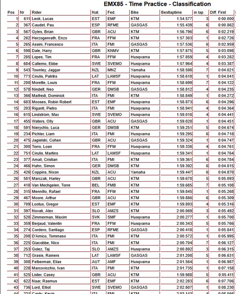 Lucas Leok heeft in de tijdtraining van de EMX85 de snelste tijd gereden, met een tijd van 1:54:577 was hij bijna een seconde sneller dan de nummer twee Pau Caudet.