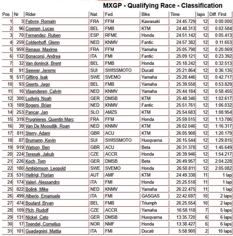 Romain Febvre heeft de kwalificatie race in de MXGP van Tsjechië gewonnen. Lucas Coenen werd tweede gevolgd door de Spanjaard Ruben Fernandez.