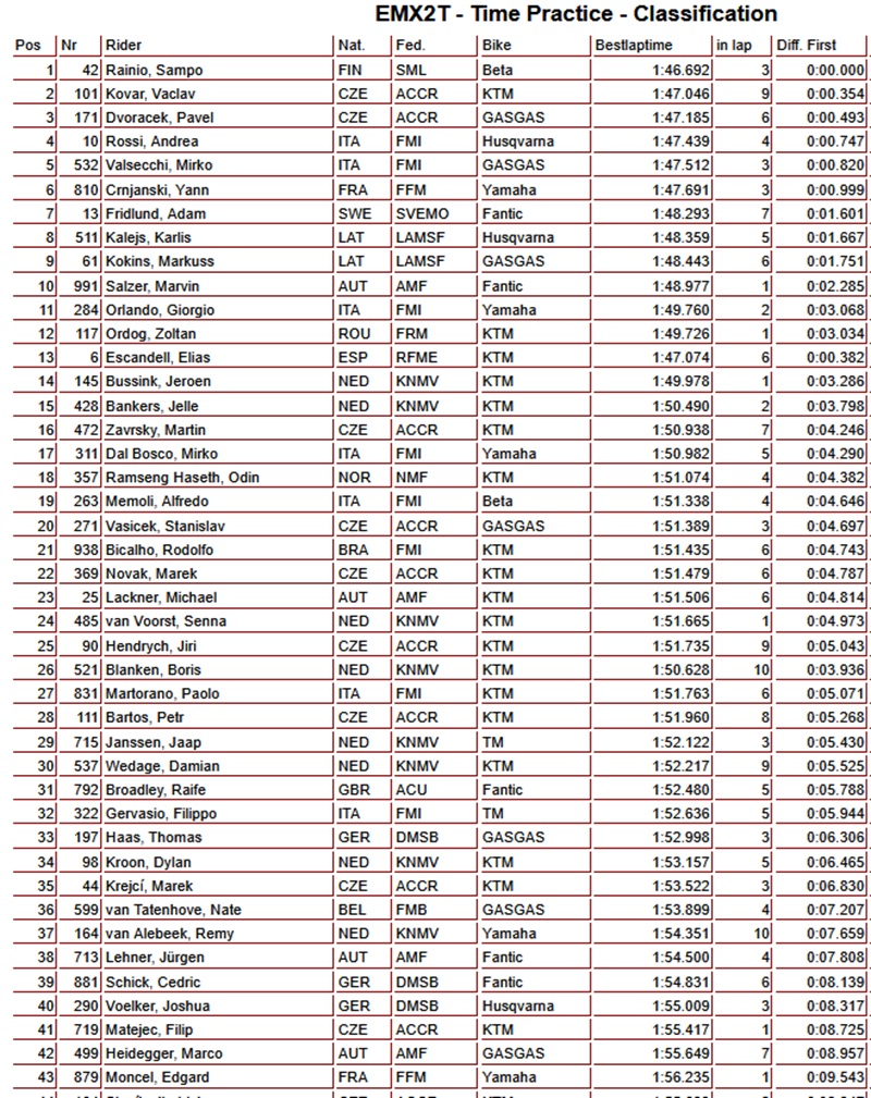 Ook Senna van Voorste (24e), Boris Blanken (26e), Jaap Janssen (29e), Damian Wedage (30e), Dylan Kroon (34e) en Remy van Alebeek (37e) wisten zich allen te plaatsen voor de wedstrijden later dit weekend. Lex Mastenbroek wist zich helaas niet te kwalificeren, de eerste manche voor de EMX2T is vanmiddag om 13:00 en de tweede manche is morgenochtend om 08:40.