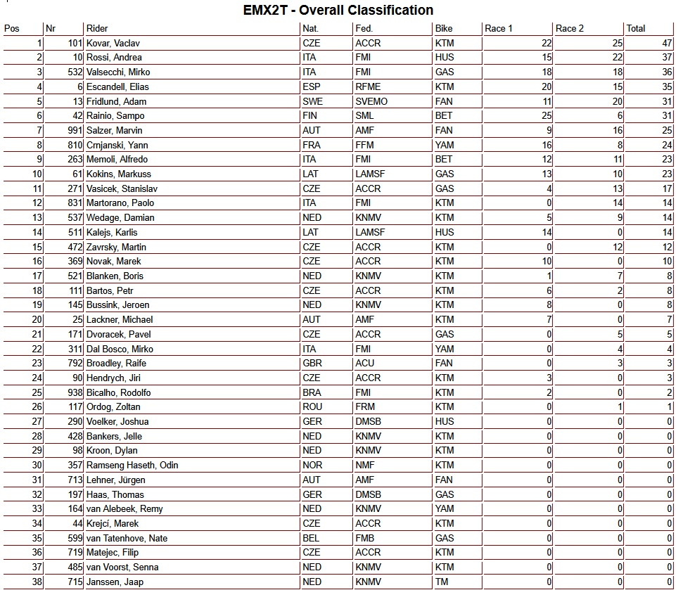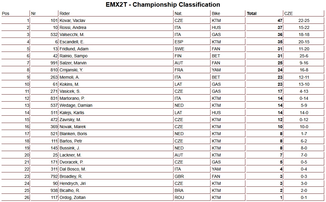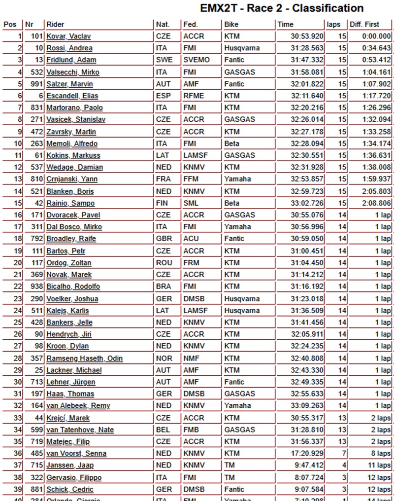 Vaclav Kovar heeft op zondagochtend de tweede manche van de EMX2T gewonnen, dit opgeteld bij de tweede plaats van gisteren was het voldoende om de Europese titel in de wacht te slepen. In de tweede manche kwam Andrea Rossie als tweede over de finish en Adam Fridlund als derde. Beste Nederlander in de tweede manche was met een 12e plaats Damian Wedage, Boris Blanken werd 14e, Jelle Bankers 25e, Dylan Kroon 27e, Remy van Alebeek 32e, Senna van Voorst 36e en Jaap Janssen 37e. Jeroen Bussink, die gisteren nog als beste Nederlander werd geklasseerd kwam door nog onbekende redenen niet aan de start.