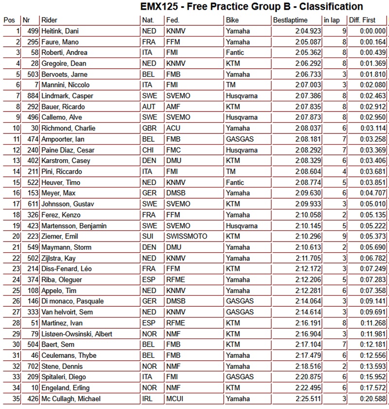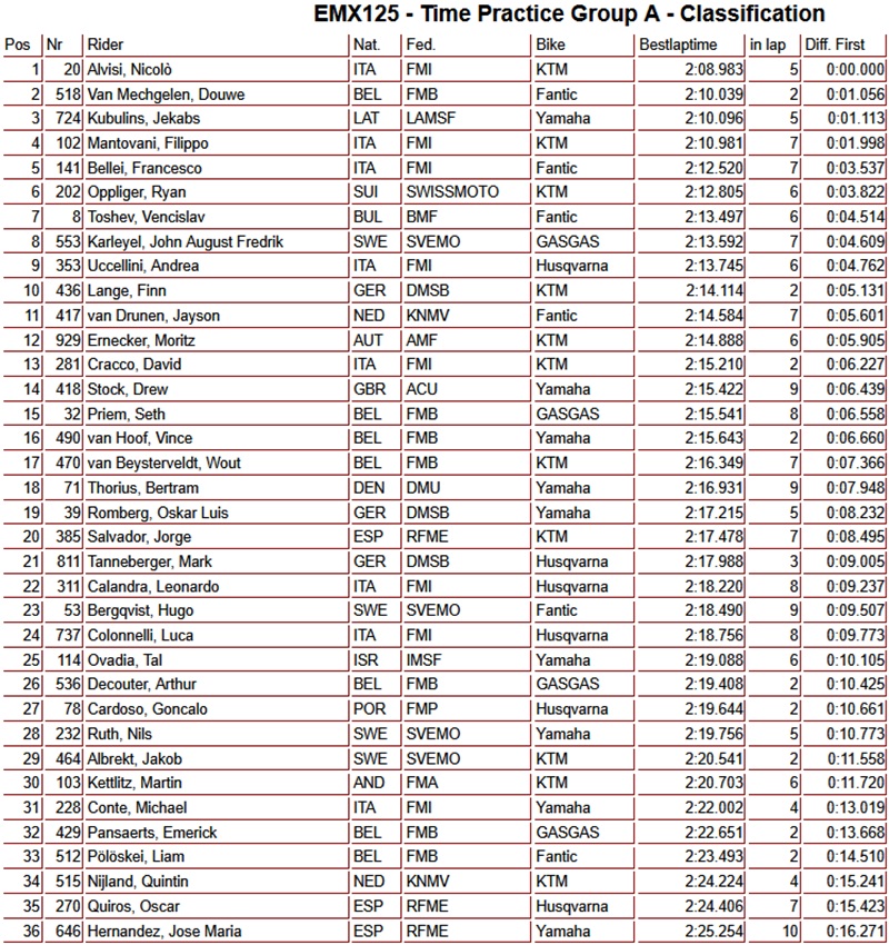 Alvisi en Heitink snelste in tijdtraining EMX125 in Lommel by motocrossplanet2 augustus 20252 augustus 2025 Nicolo Alvisi en Dani Heitink hebben in de tijdtraining van de EMX125 klasse in Lommel de snelste tijd op de klok weten te zetten. Bekijk de volledige uitslagen hieronder: Photocredits – Mediacross