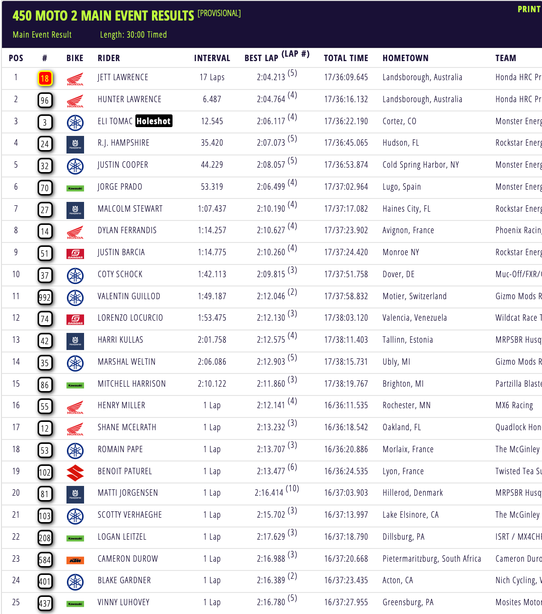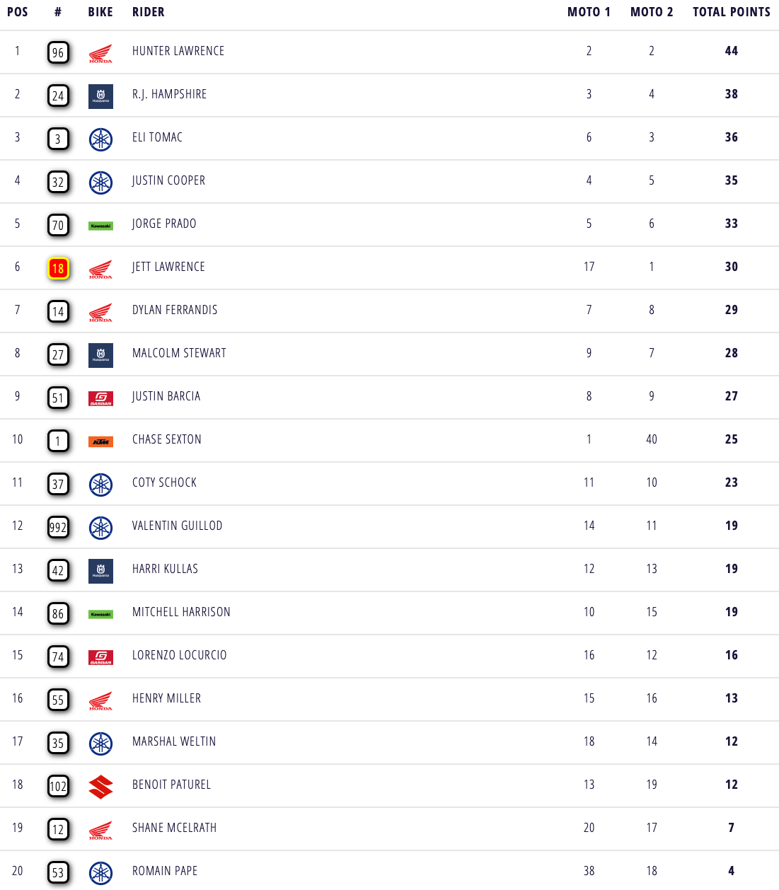 Achter de gebroeders Lawrence werd Eli Tomac derde in de tweede manche voor RJ Hampshire en Justin Cooper. Jorge Prado reed lang op een vijfde plaats maar moest deze positie in de laatste ronde nog afstaan aan Cooper.