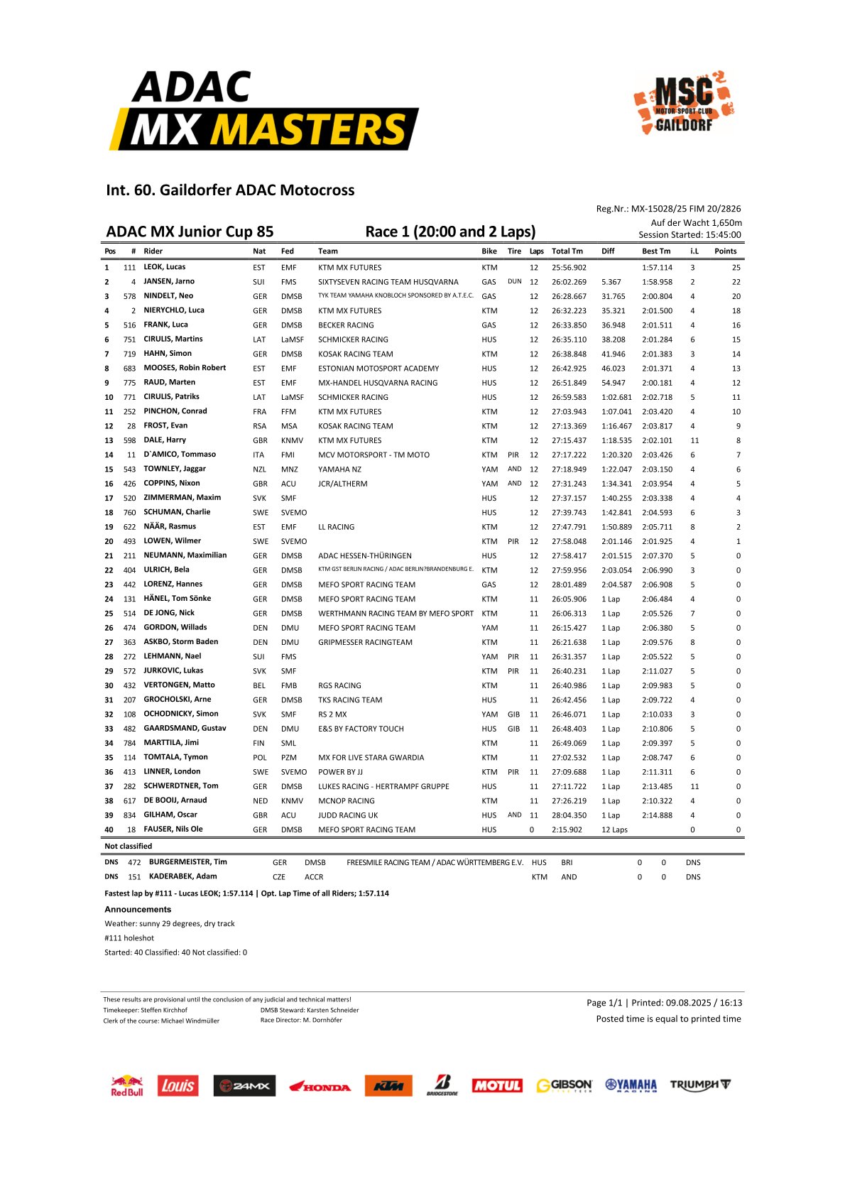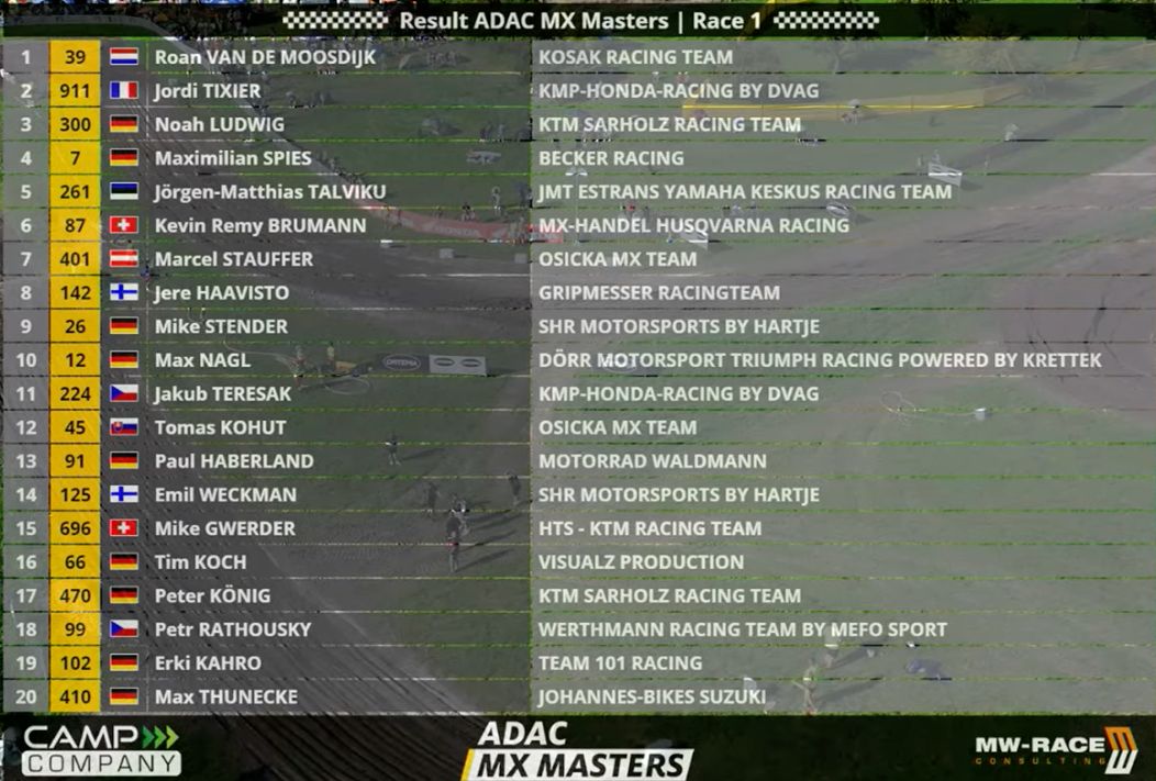 De eerste manches van de ADAC Masters Series in Gaildorf zijn gewonnen door Roan van de Moosdijk, Maxime Grau en Lucas Leok. Van de Moosdijk won de eerste manche van de Masters klasse voor Jordi Tixier en Noah Ludwig. Max Spies en Jorgen Mathias Talviku werden vierde en vijfde. Kampioenschap leider Max Nagl kwam niet verder dan een tiende plaats.