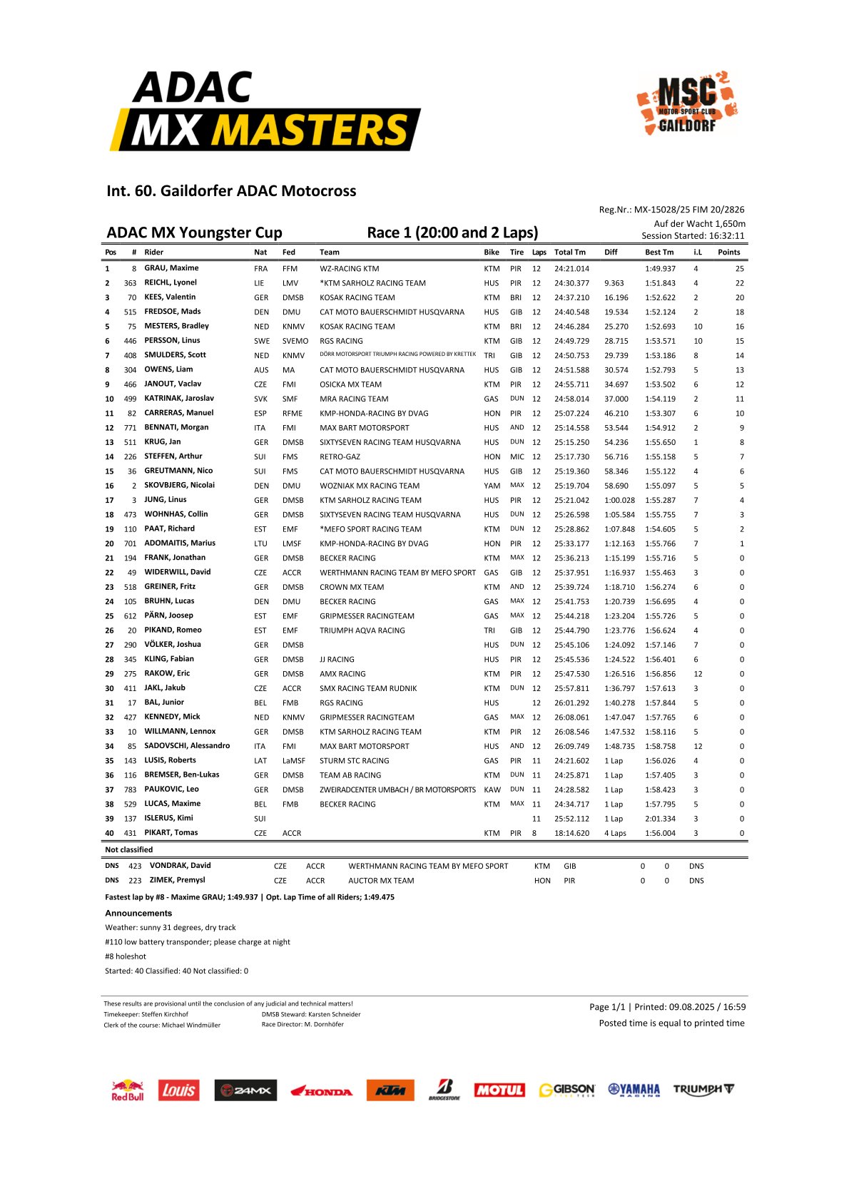 De eerste manche van de Youngster Cup werd gewonnen door Maxime Grau voor Lyonel Reichl en Valentin Kees werd derde. Mads Fredsoe finishte als vierde voor Bradley Mesters, die aan de leiding blijft staan in de tussenstand. Ook Scott Smulders reed een goede manche en wist als zevende te finishen. Mick Kennedy (32) en Maxime Lucas (38) eindigden buiten de punten.