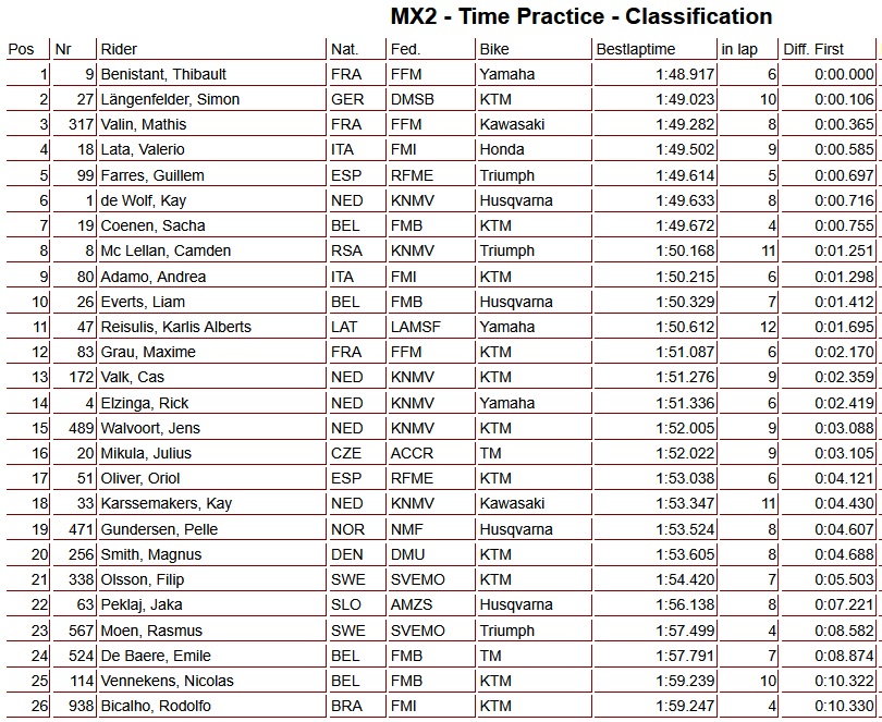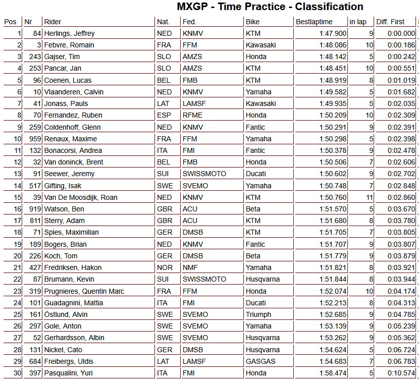 Benistant en Herlings snelste in tijdtraining MXGP Zweden by motocrossplanet16 augustus 2025 Thibault Benistant en Jeffrey Herlings hebben in de tijdtraining van de MXGP in Zweden de snelste tijd op de klok weten te zetten. Bekijk hieronder de uitslagen: Photocredits – Juan Pablo