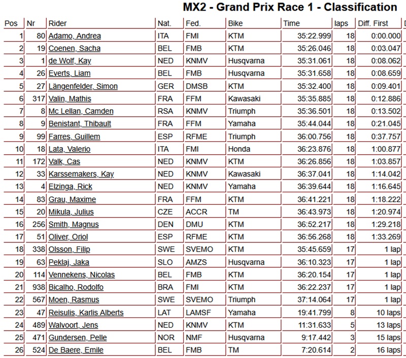 Andrea Adamo heeft de eerste manche van de MXGP in Zweden gewonnen voor Sacha Coenen, die lang aan de leiding reed. Kay de Wolf wist in de slotfase Liam Everts te passeren en werd derde voor Everts en Simon Laengenfelder. Hiermee verkleint de Wolf zijn achterstand naar 35 punten.