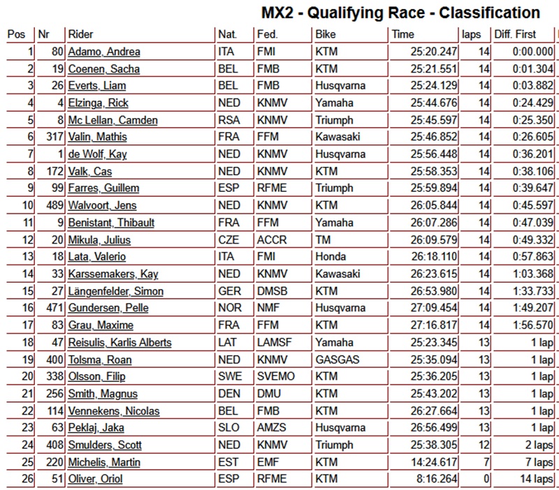 Andrea Adamo heeft de kwalificatie race in de MX2 gewonnen, voor Sacha Coenen, Liam Everts, Rick Elzinga.