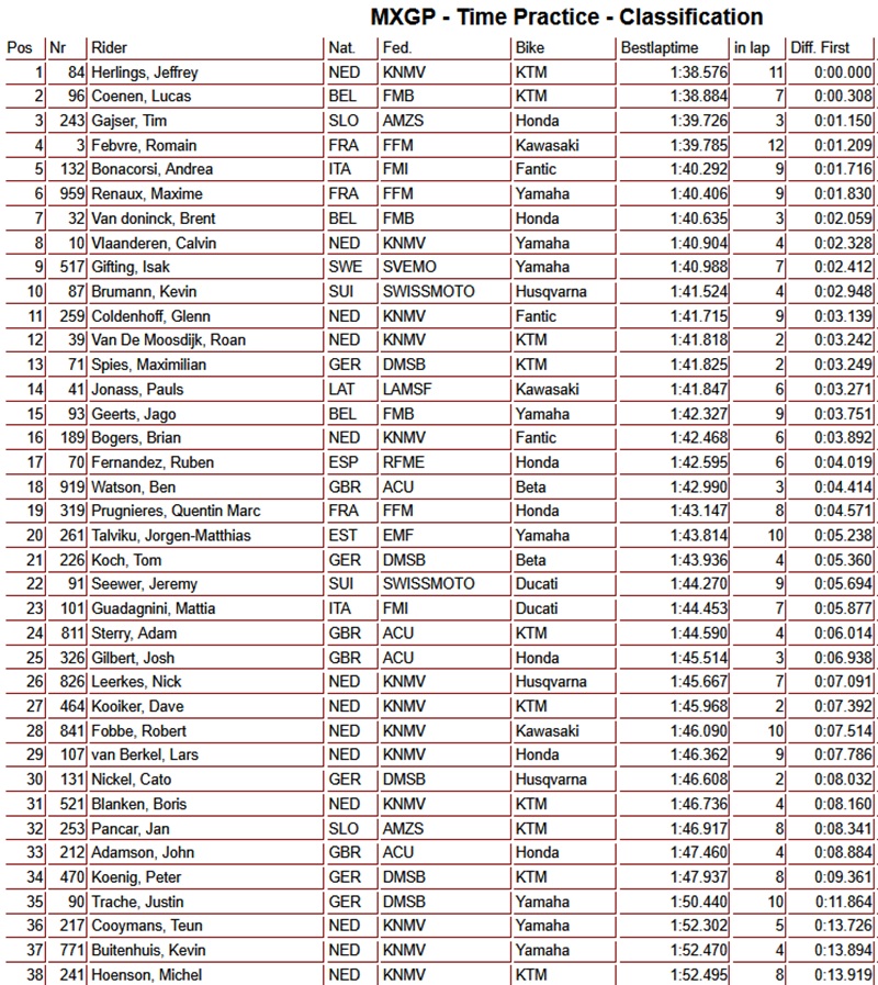 Jeffrey Herlings mag vanmiddag als eerste oprijden tijdens de kwalificatie race in de MXGP-klasse, de crosser uit Oploo zette in de slotseconde van de sessie de snelste tijd op klokken. Achter Herlings kwam Lucas Coenen tot de tweede tijd en Tim Gajser zette een derde tijd neer. Leider in het Wereldkampioenschap Romain Febvre kwam tot de vierde tijd.