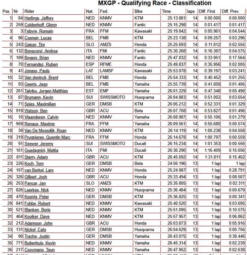 Coldenhoff begon de manche aan de leiding tot hij halverwege voorbij werd gestoken door Herlings. Leider in de tussenstand van het Wereldkampioenschap Romain Febvre werd derde voor Lucas Coenen en Tim Gajser. Brian Bogers wist ook binnen de top tien te finishen op plek zeven.