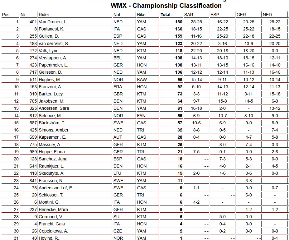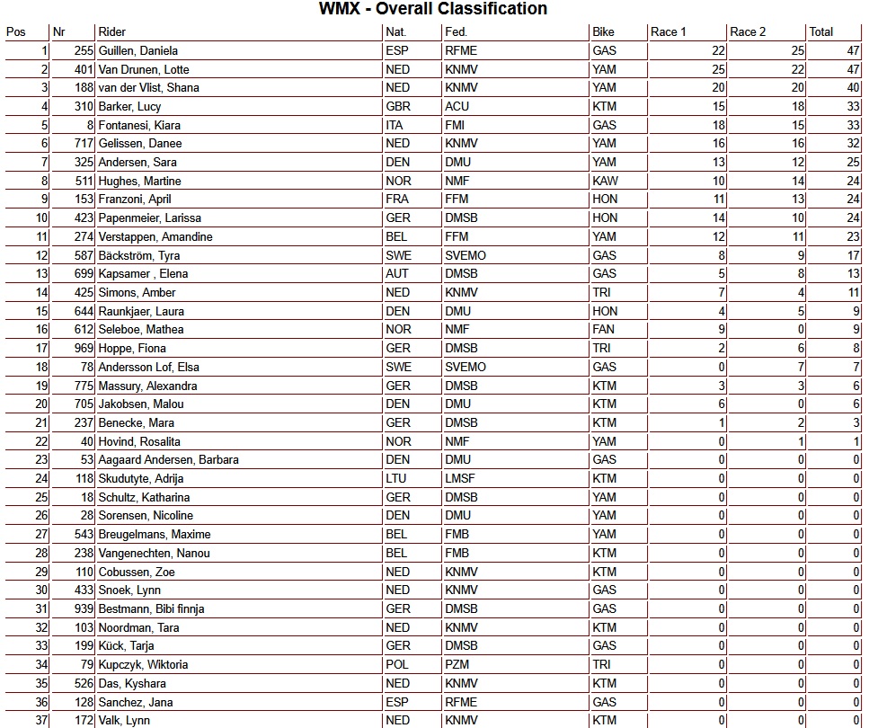 Daniela Guillen heeft de tweede manche gewonnen tijdens de WMX in Arnhem, hierdoor won ze ook de Grand Prix. Lotte van Drunen kende een mindere start waarna ze een achterstand van tien seconden had op de koploopster, de Nederlandse kwam nog heel erg dichtbij maar 0,1 seconde te kort om de wedstrijd te winnen. Shana van der Vlist werd opnieuw derde.