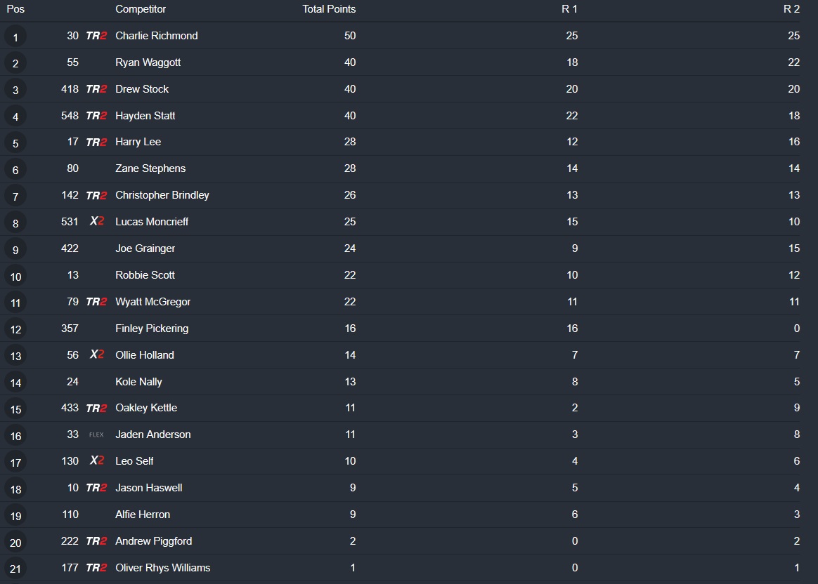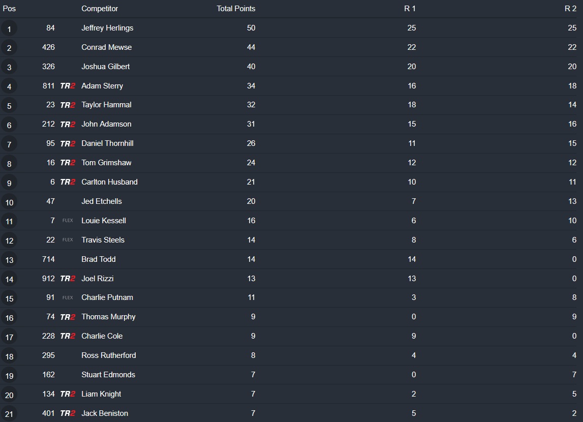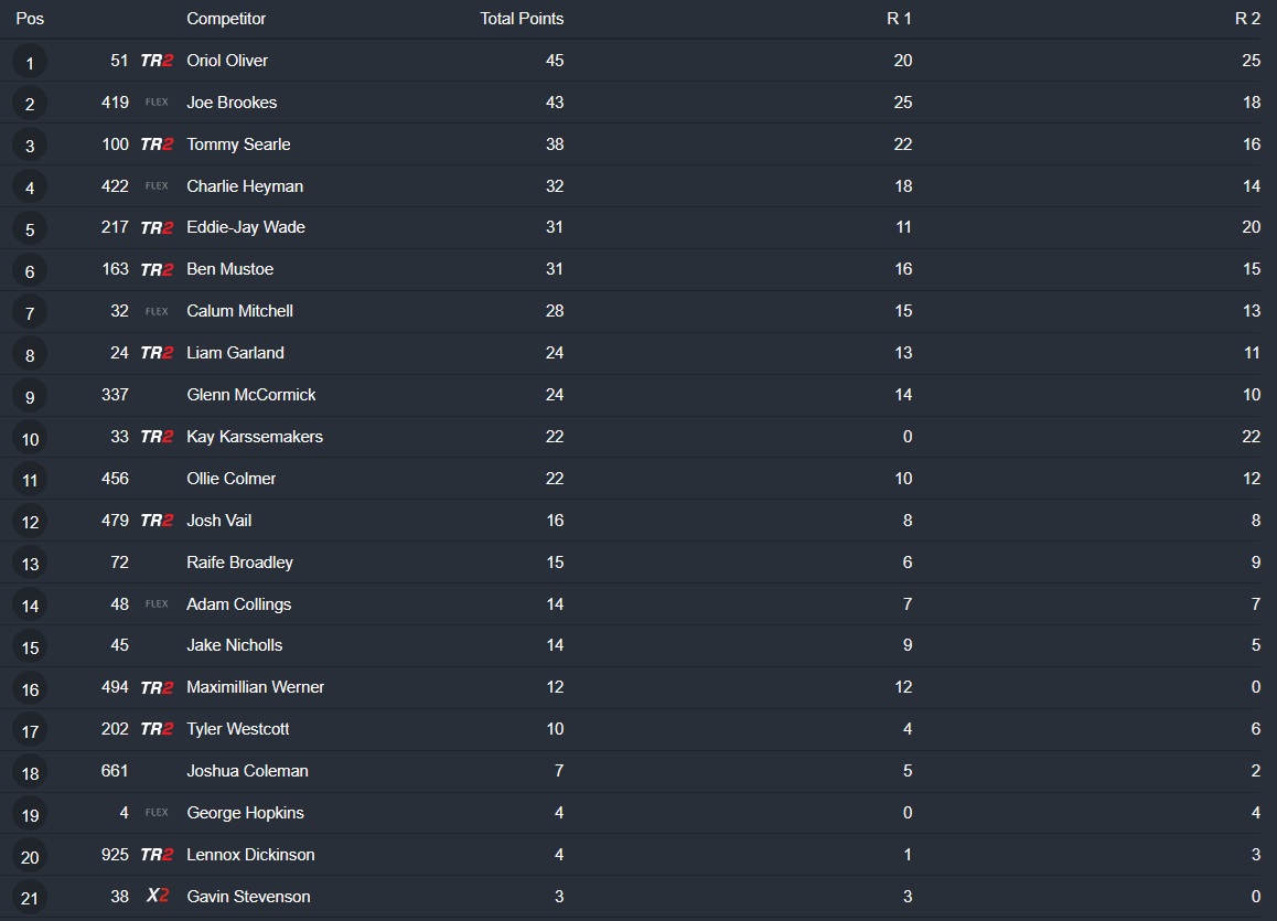 Oriol Oliver ging er met de zege in de MX2 klasse vandoor met een 3-1 in de manches voor Joe Brookes 1-4 en Tommmy Searle 2-5. Charlie Heyman en Eddie Jay Wade sloten de dag af op een vierde en vijfde plaats in het dagklassement.