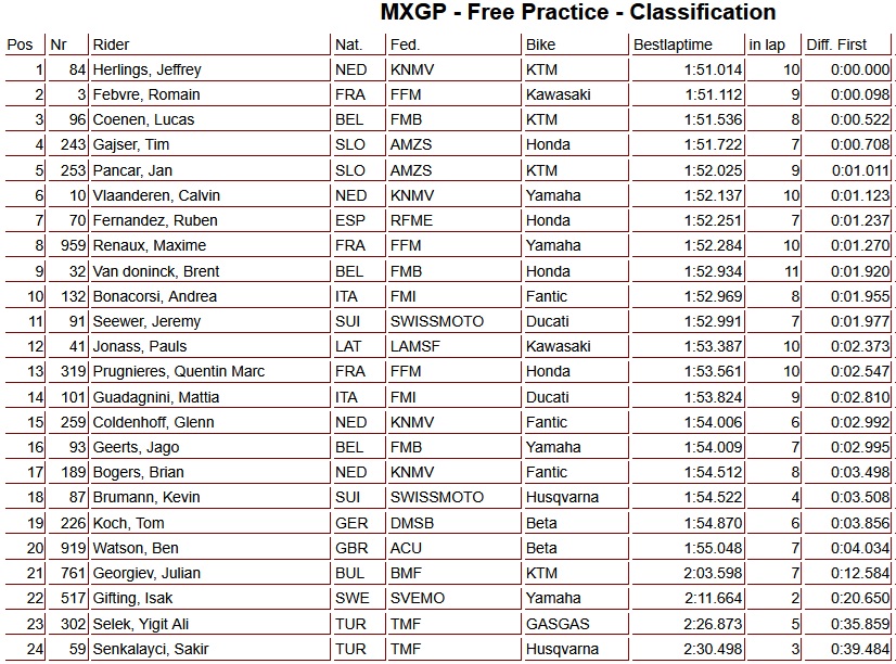 Jeffrey Herlings heeft in de vrije training van de MXGP in Turkije zijn visitekaartje afgegeven door de snelste tijd op de klok te zetten. Romain Febvre en Lucas Coenen zaten hier dicht achter. Tim Gajser trainde als vierde maar kwam hard ten val na een schans en verdween gelijk terug naar het paddock.