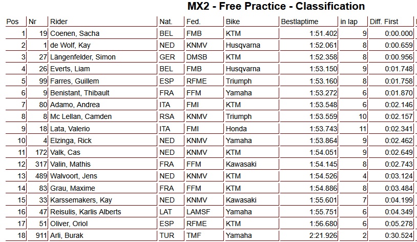 In de MX2 klasse was Saca Coenen het snelste voor Kay de Wolf en Simon Laengenfelder. Liam Everts kwam uit op een vierde tijd voor Guillem Farres. Rick Elzinga en Cas Valk trainden als tiende en elfde en Jens Walvoort kwam uit op een dertiende tijd. Kay Karssemakers zette een vijftiende tijd op de klok.