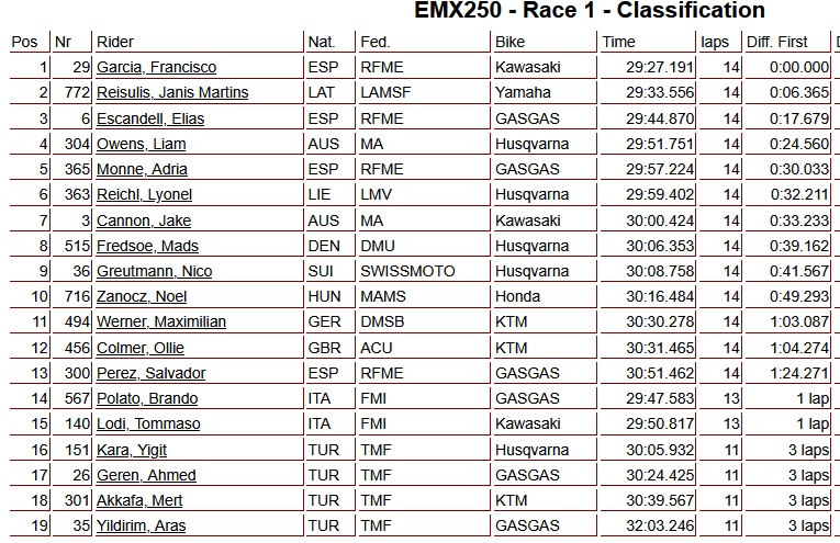 Janis Reisulis pakt de EMX250 titel in Turkije by motocrossplanet6 september 20256 september 2025 Janis Reisulis heeft zich met een tweede plaats in de eerste manche in Turkije verzekerd van de EMX250 titel. Francisco Garcia won de manche en Elias Escandell werd derde. Bekijk hieronder de volledige uitslagen: Photocredits – Fullspectrum Media