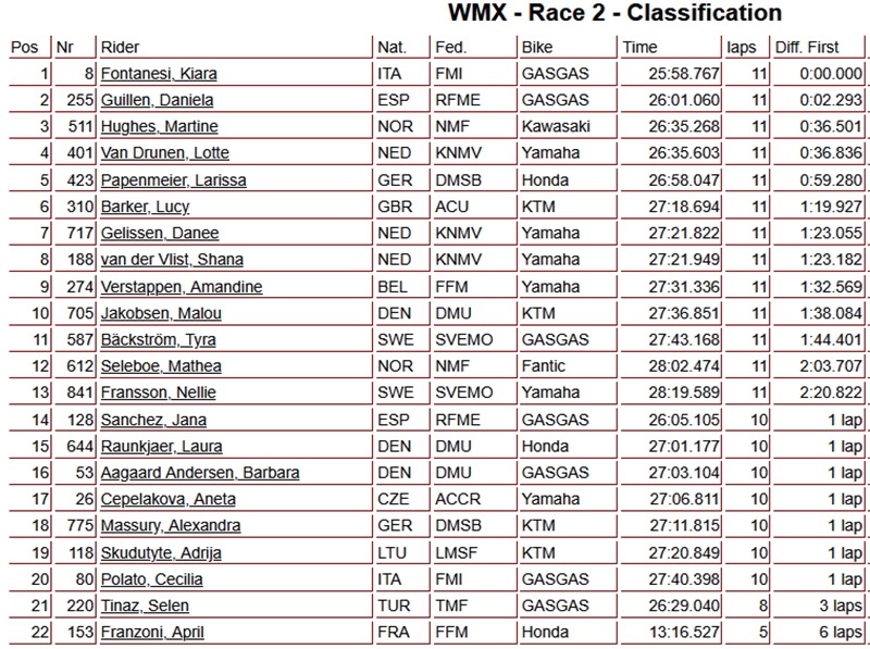 Kiara Fontanesi heeft de tweede manche tijdens de Grand Prix in Turkije op haar naam geschreven, de Italiaanse nam in de eerste ronde de leiding en stond deze niet meer af. Achter haar was het de Spaanse Daniela Guillen en derde Martine Hughes. Op de vierde plaats was het de leidster in het wereldkampioenschap Lotte van Drunen, de Nederlandse kende een slechte start waarna ze als elfde aan de wedstrijd moest beginnen. Na een sterke inhaalwedstrijd kwam ze nog tot het achterwiel van Hughes maar helaas lukte het niet meer om de derde plaats over te nemen.