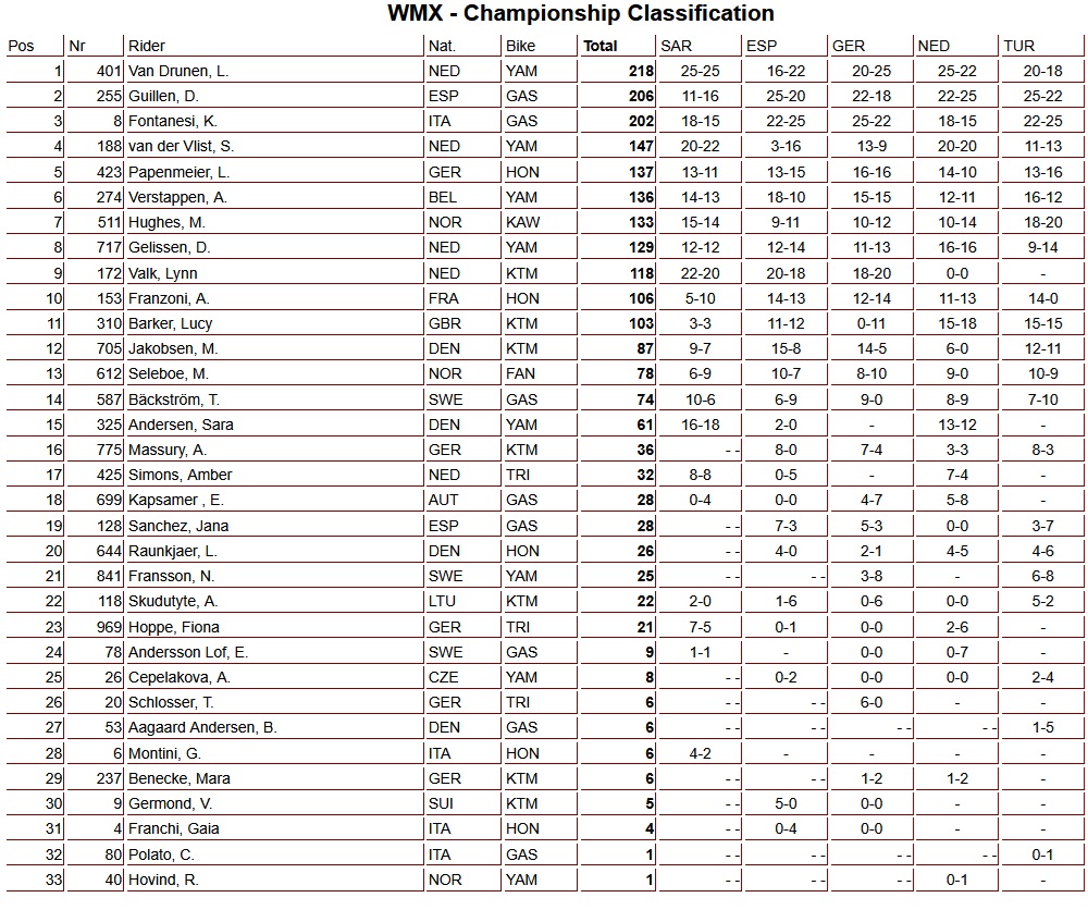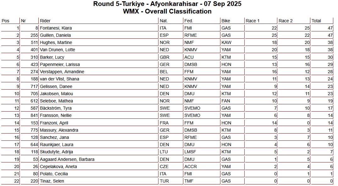 Danee Gelissen kwam als zevende over de finish gevolgd door Shana van der Vlist. Met een de tweede plaats van gisteren en de overwinning van vandaag won Fontanesi de Grand Prix voor Guillen en Hughes. Met nog één Grand Prix te gaan behoud Lotte van Drunen de leiding in het Wereldkampioenschap met 218 punten, Danielle Guillen staat op plaats twee met 206 punten en Kiara Fontanesi zakt een plek naar drie met 202 punten.
