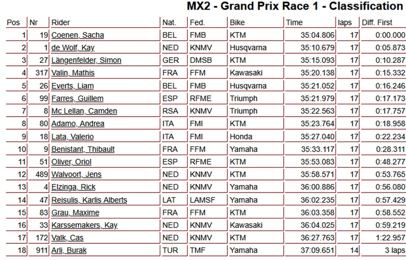 Sacha Coenen heeft de eerste manche in Turkije op zijn naam geschreven, de Belg reed van start tot finish aan de leiding. Achter Coenen was het regerend Wereldkampioen Kay de Wolf die als tweede eindigde voor de leider in de tussenstand Simon Langenfelder. Hiermee pakt de Wolf opnieuw twee punten terug ten opzichte van de Duitser en is het verschil nog slechts negen punten. Matthis Valin werd afgevlagd als vierde en Liam Everts kwam als vijfde over de streep.