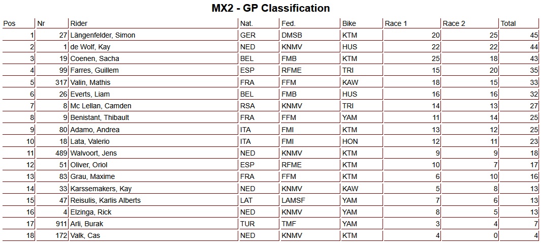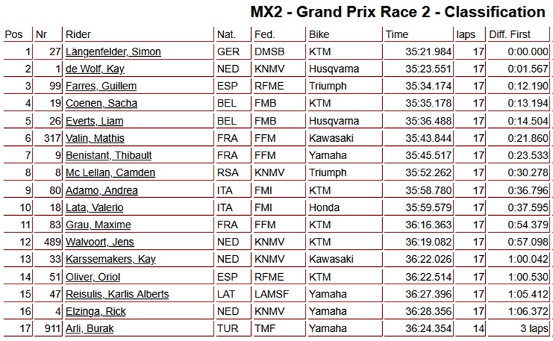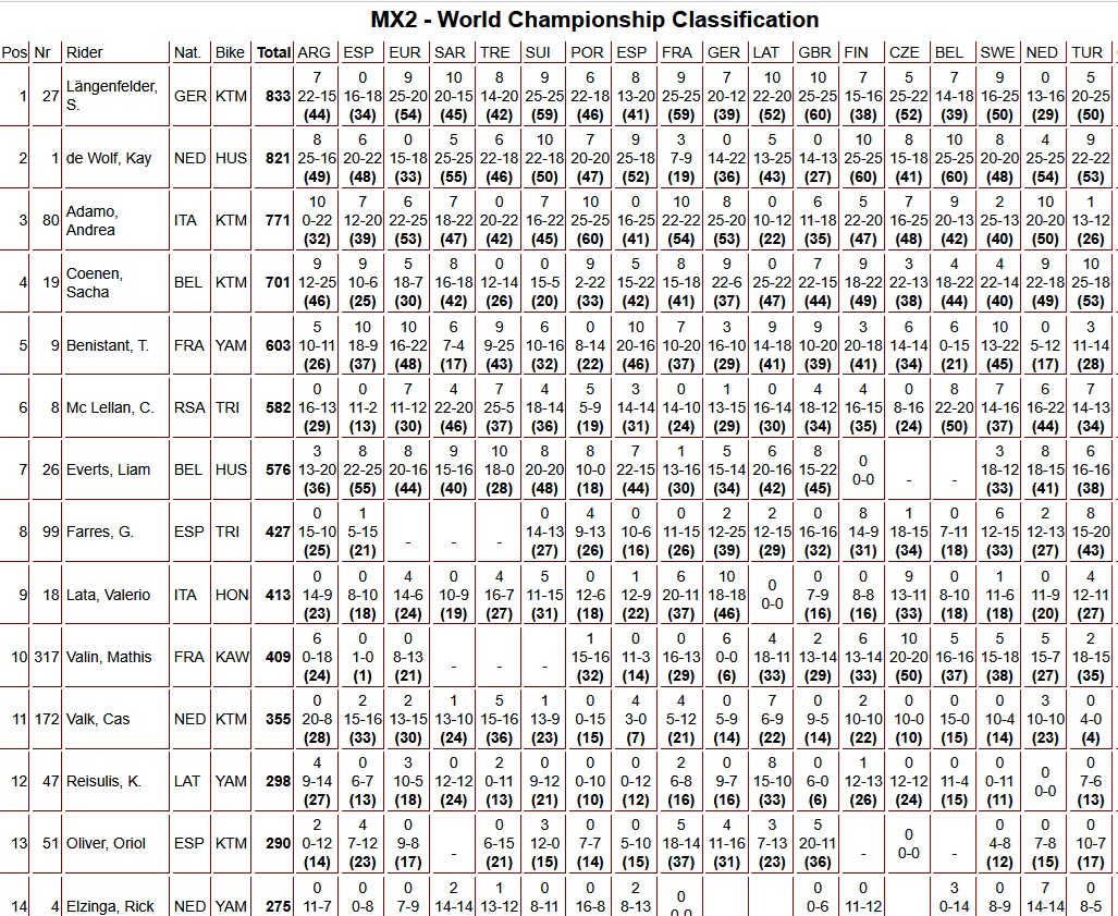 Met nog twee Grand Prix te gaan blijft het ongekend spannend in de MX2; Simon Langenfelder staat op 833 punten, op twaalf punten gevolgd door Kay De Wolf 821 en Andrea Adamo staat nu op 771 punten.