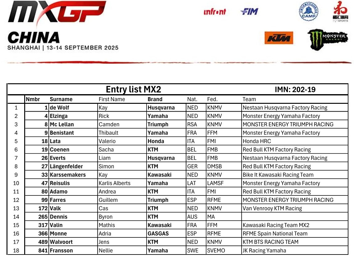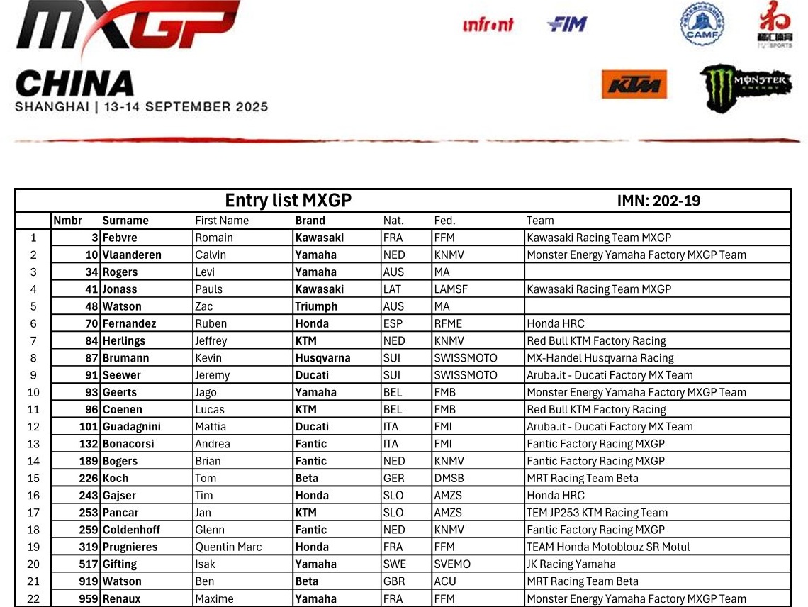 Deelnemerslijst MXGP China bekend by motocrossplanet8 september 2025 Aankomend weekend gaat het wereldkampioenschap verder in China. Bekijk hieronder wie er allemaal aan de start komen. Photocredits – Fullspectrum Media