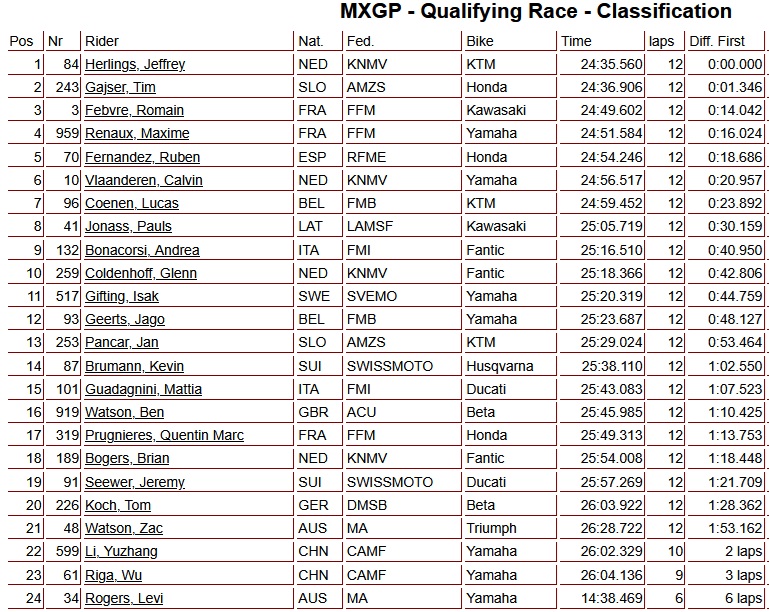 Jeffrey Herlings heeft de MXGP-kwalificatie heat op zijn naam geschreven, vlak voor de start was er een opvallend beeld van Herlings die problemen had met een beslagen bril, maar dit leidde hem niet af en na de holeshot gaf hij de leiding niet meer af. Achter Herlings wist Tim Gajser het tempo goed te volgen en eindigde als tweede voor Romain Febvre. De nummer twee in de stand voor het Wereldkampioenschap Lucas Coenen werd zevende.