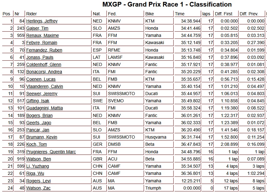 Jeffrey Herlings heeft de eerste manche gewonnen tijdens de MXGP van China. Maxime Renaux kende de beste start en wist daarna tot de 15e ronde de leiding vast te houden tot hij voorbij werd gestoken door Herlings. Tim Gajser wist met nog twee ronden te gaan de Fransman ook te passeren waarna Renaux als derde over de finish kwam voor landgenoot en Kampioenschapsleider Romain Febvre. Laatstgenoemde deed hele goede zaken in de strijd voor de Wereldtitel want zijn grootste concurrent Lucas Coenen kwam niet verder dan een negende plaats.