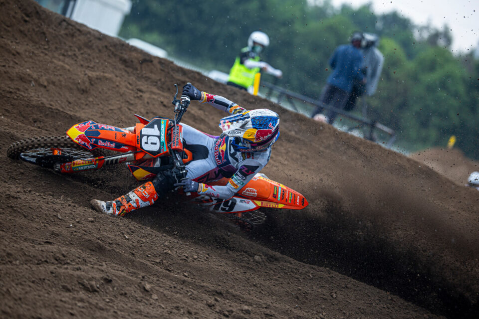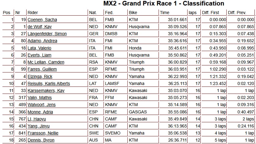 Onder zeer zonnige omstandigheden was het net als gisteren Sacha Coenen die de kopstart greep en daarna een gat van tien sloeg naar de concurrentie, het leek een foutloze wedstrijd te worden voor de jonge Belg tot hij in de laatste ronde het nog spannend maakte door van de baan te raken. Achter Coenen kwam Kay de Wolf uiteindelijk op acht seconden als tweede over finish met een ruime marge op Simon Langenfalder. De nummer drie in de tussenstand van het Wereldkampioenschap MX2 Andrea Adamo eindigde als vierde voor Valerio Lata die vijfde werd.