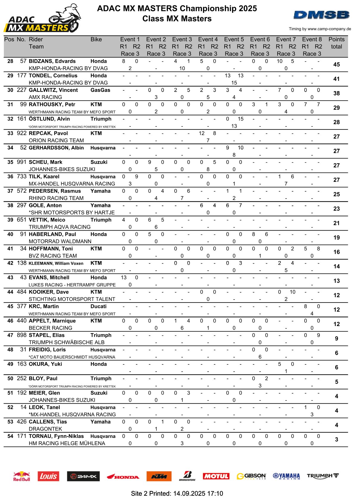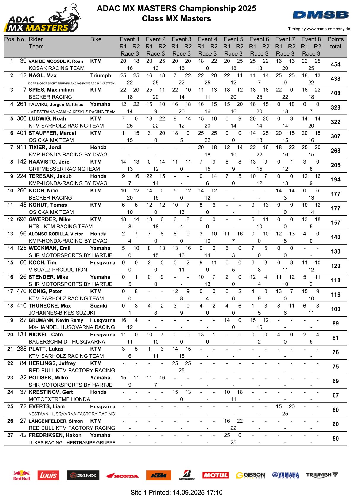 Na nachtelijke regenval werden de rijders bij de seizoensfinale van de ADAC MX Masters in Holzgerlingen geconfronteerd met uitdagende omstandigheden op de Schützenbühlring. Roan van de Moosdijk (NL/Kosak Racing Team) kroonde zich met twee mancheoverwinningen op zondag tot de nieuwe ADAC MX Masters-kampioen. Jordi Tixier (F/KMP-Honda-Racing powered by DVAG) wist met een tweede plaats opnieuw het podium te halen. Maximilian Spies (D/Becker Racing) eindigde sterk als derde. Max Nagl (D/Dörr Motorsport Triumph Racing powered by Krettek) werd vierde in Holzgerlingen en daarmee vicekampioen.