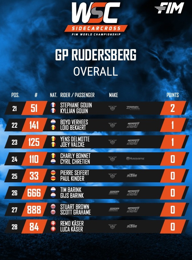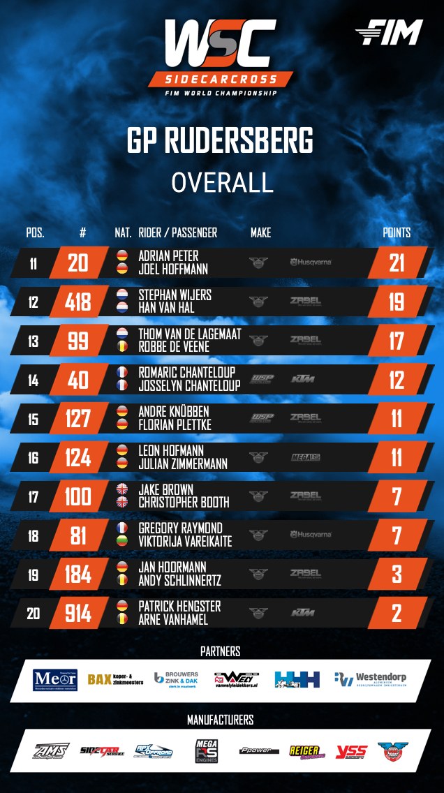 In het Duitse Rudersberg is de zijspancombinatie van Hermans/van den Bogaart erin geslaagd om de wereldtitel te pakken. Met een achterstand van twee punten kwamen ze naar Rudersberg maar met een 1-3 in de manches scoorden ze voldoende punten om de leiding terug over te nemen en de titel binnen te halen. Gebroeders Prunier werden tweede in de eindstand voor Wilkinsson/Millard.