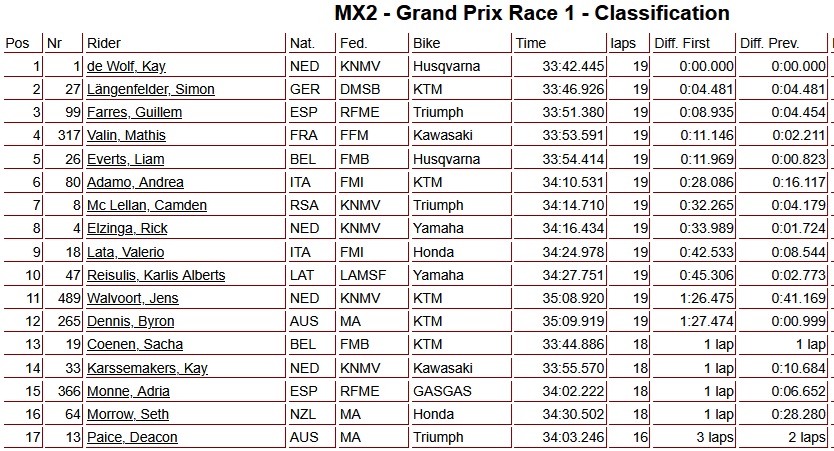 Kay de Wolf heeft de eerste manche gewonnen tijdens de Grand Prix in Australie, hiermee is het verschil met Simon Langenfelder bij het ingaan van de laatste manche van het seizoen nog 10 punten. In de beginfase was het Guillem Farres die de leiding nam tot kampioenschapsleider Simon Langenfelder hem voorbijkwam. Nadat Kay de Wolf de Spanjaard ook had ingerekend opende hij de jacht op Langenfelder. Met nog enkele ronden te gaan lukte het Kay de Wolf de leiding over te nemen en wist hij de eerste manche op zijn naam te schrijven.