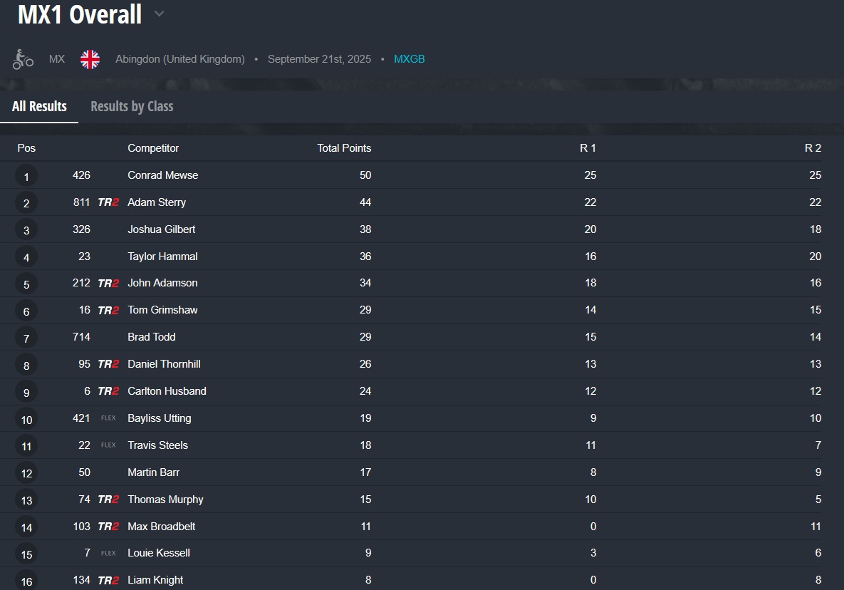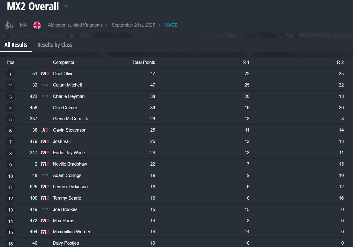 In de MX2 klasse won Oriol Oliver de dagzege met een 2-1 in de manches voor Calum Mitchell 1-2 en Charlie Heyman 3-4. Ollie Colmer werd vierde in het dagklassement voor Glenn McCormick. Tommy Searle scoorde in de eerste manche en eindigde in de tweede manche als vijfde. Toch was dit voldoende om de titel te pakken.