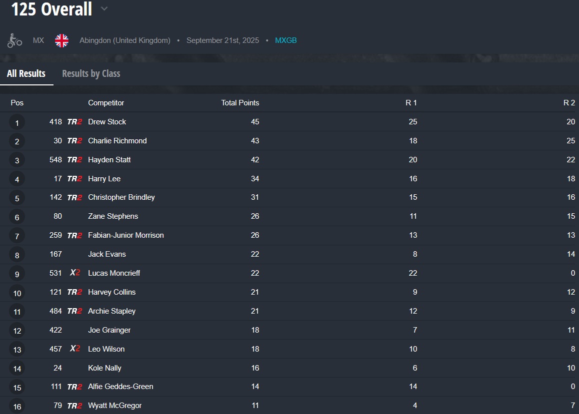 In de 125cc klasse ging de titel naar Charlie Richmond. De overwinning in Lyng ging naar Drew Stock met een 1-3 voor Charlie Richmond 4-1 en Hayden Statt 3-2.
