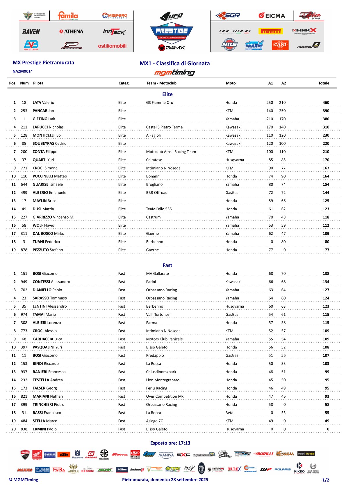 In de MX1 klasse ging de winst naar Valerio Lata met een 1-2 in de manches voor Jan Pancar 7-1 en Isak Gifting 2-4. Nicholas Lapucci en Ivo Monticelli maakten de top vijf compleet.