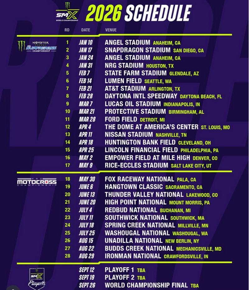 Supermotocross kalender 2026 bekend – 31 wedstrijden by motocrossplanet30 september 2025 De kalender van het Supermotocross kampioenschap 2026 in Amerika is bekend. De kalender bestaat uit maar liefst 31 wedstrijden. Bekijk de kalender hieronder! Photocredits – Align Media