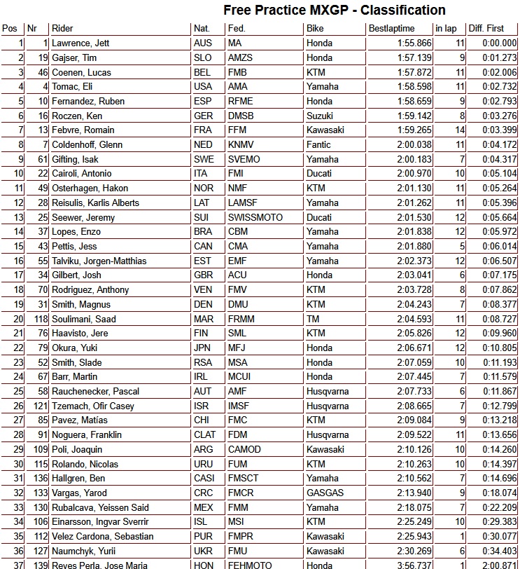 Jett Lawrence heeft in de vrije training van de MX of Nations in Amerika de snelste tijd neer gezet. Het verschil met Tim Gajser was 1.3 sec en Lucas Coenen trainde als derde. Nederlander Glenn Coldenhoff zette een solide achtste tijd op de klok. Bekijk de uitslagen hieronder!