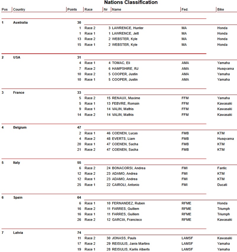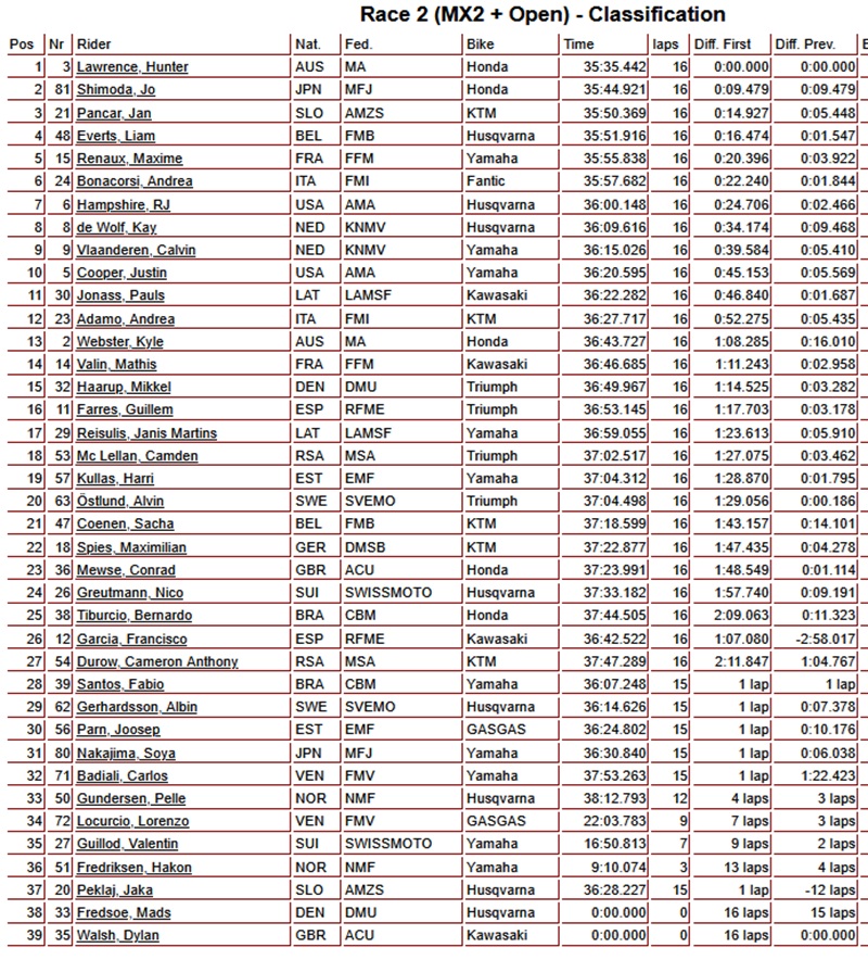 Kay de Wolf die na een korte pauze voor de tweede keer aan de start stond was op een achtste plaats opnieuw de beste MX2 rijder. De Wolf wint hierdoor ook de overall in zijn klasse. Achter Kay de Wolf wist Calvin Vlaanderen, beide Nederlanders moesten van buiten de top vijftien komen, als negende over de finish te komen.