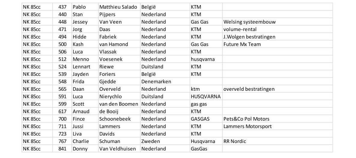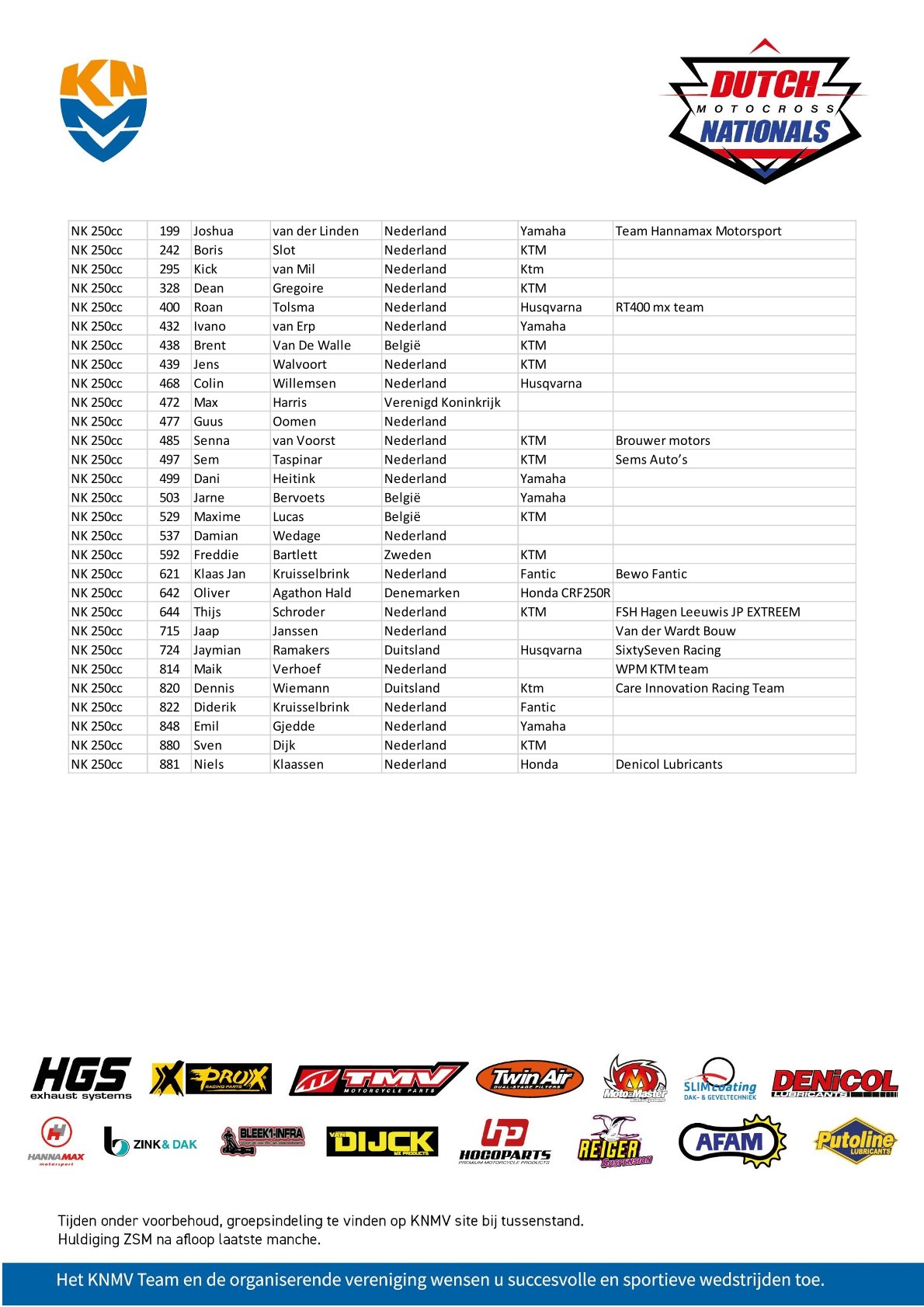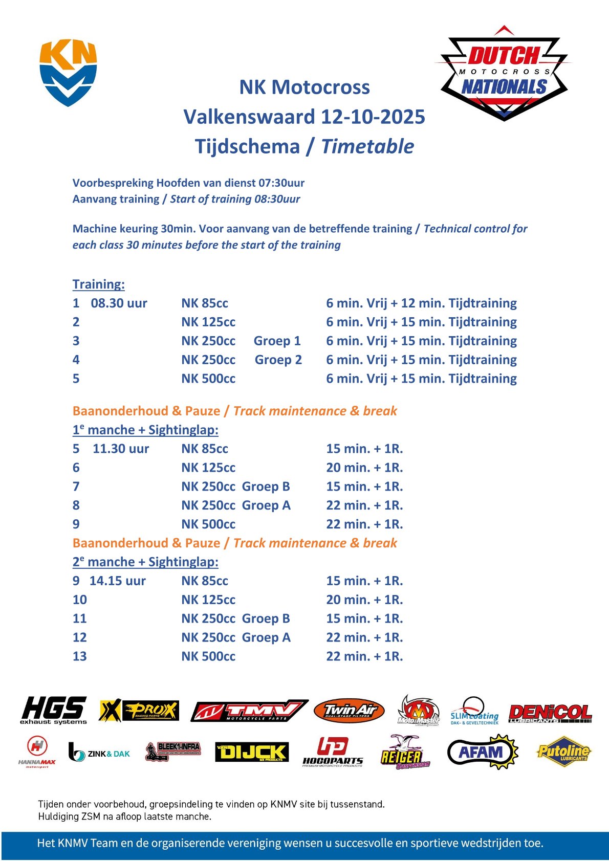Tijdschema en Deelnemerslijsten Dutch MX Season Finale Valkenswaard by motocrossplanet11 oktober 202511 oktober 2025 Aanstaande zondag wordt de grote finale van het Nederlands Kampioenschap verreden in Valkenswaard. Voor de mensen die komen kijken, is hier het tijdschema en de deelnemerslijsten: Programma Zondag Timetable | Dutch MX Season Finale Entry List | Dutch MX Season Finale Programma Zaterdag Timetable | Sidecar Quad Motocross Entry List | Sidecar Quad Motocross Photocredits – Fullspectrum Media