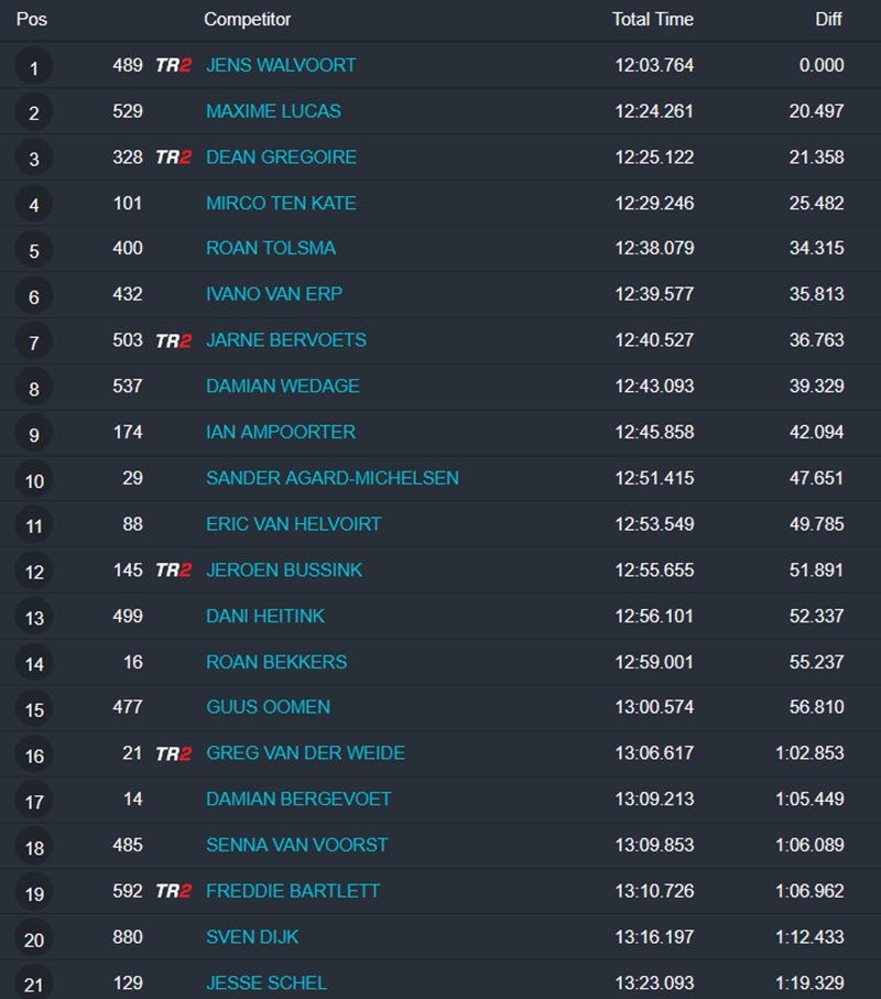 Walvoort wist met ruim 20 seconden voorsprong de zege naar zich toe te trekken, achter de winnaar was het Maxime Lucas op plek twee voor Dean Gregoire, Mirco ten Kate en Roan Tolsma.