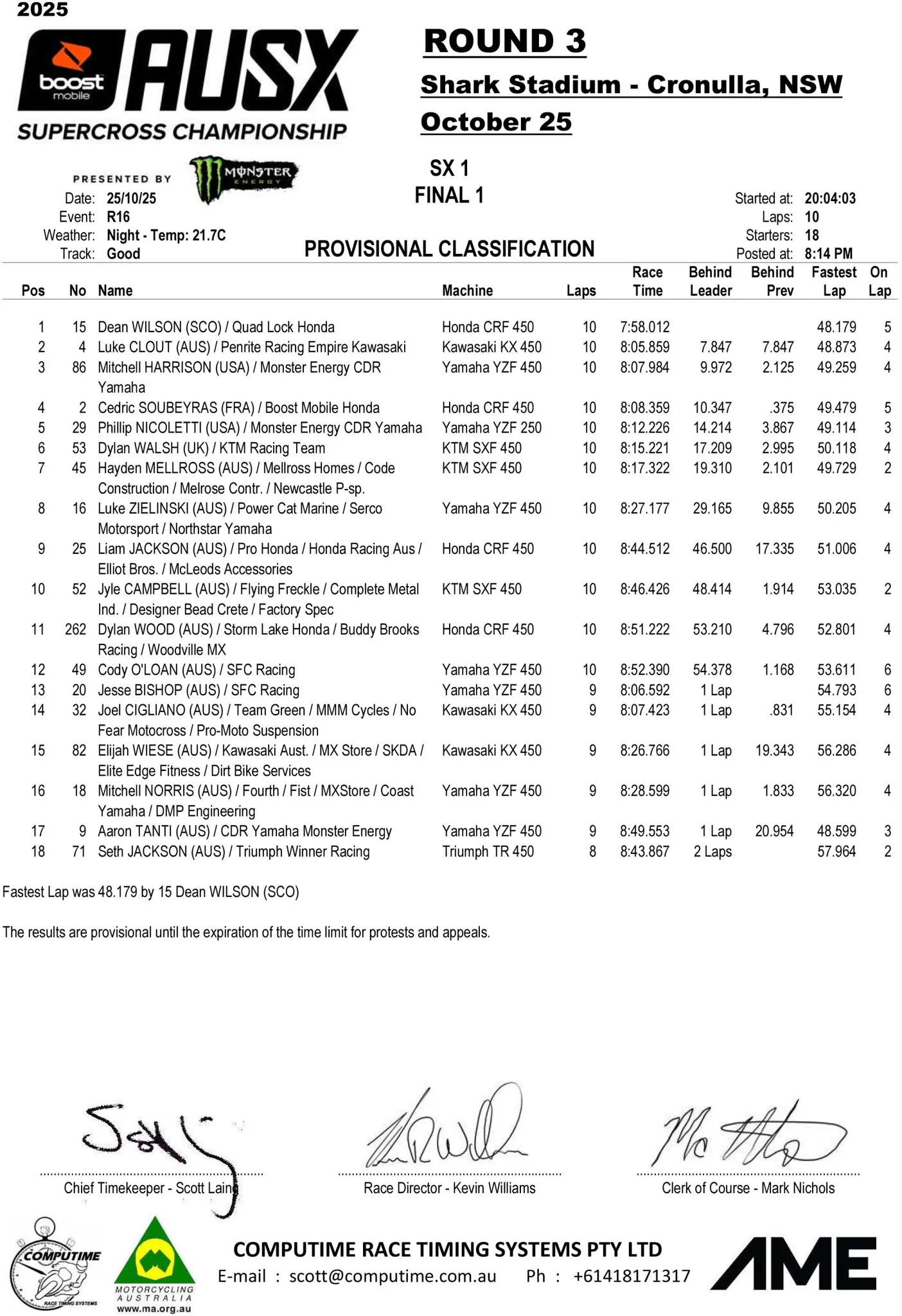 In de tussenstand van het Australisch Supercross Kampioenschap blijft Wilson aan de leiding staan met een voorsprong van 18 punten op Soubeyras en Mellross staat op een derde plaats met een achterstand van 39 punten op Wilson.