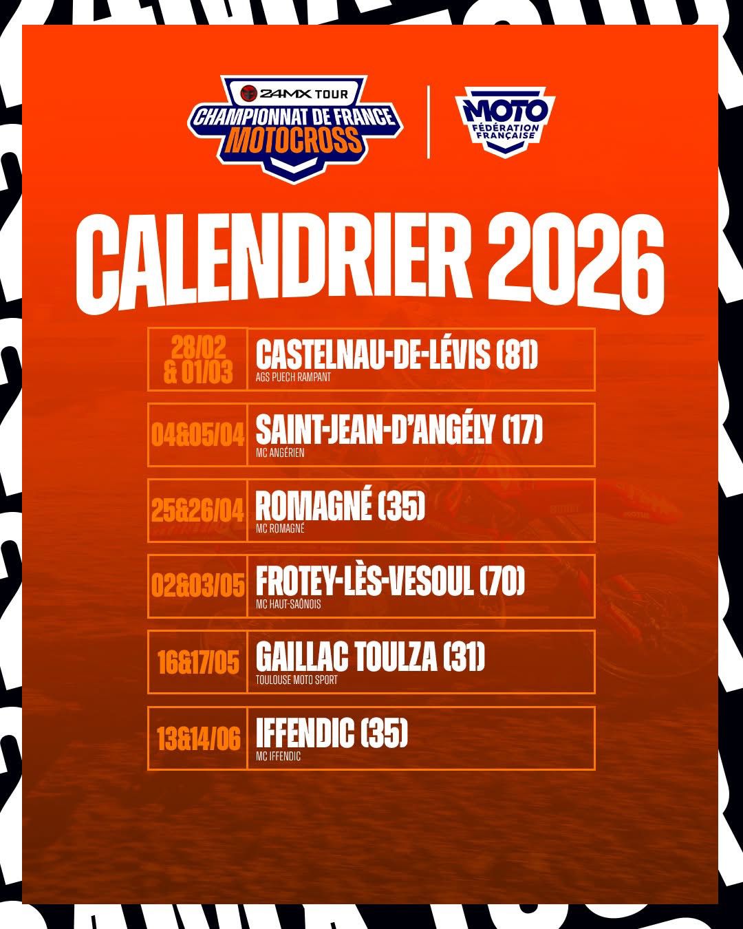 Kalender Frans Elite Kampioenschap 2026 bekend by motocrossplanet4 november 2025 De FFM heeft vandaag haar kalender voor het Frans Kampioenschap 2026 bekend gemaakt. De kalender bestaat uit zes wedstrijden. Wanneer en waar deze gehouden worden kun je nu bekijken. Photocredits – Fullspectrum Media